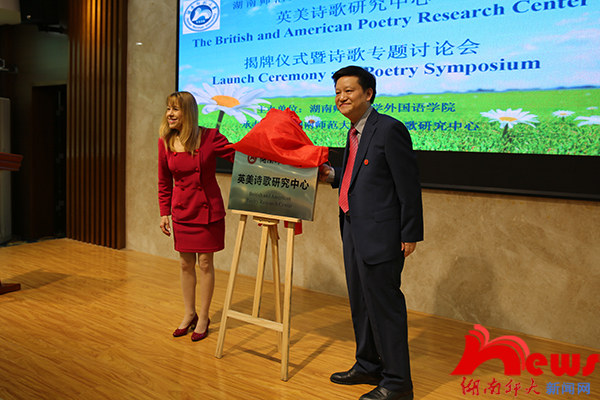 5月12日上午,我校英美诗歌研究中心揭牌仪式暨诗歌专题研讨会在外国语学院515报告厅举行。2016-2017年美国德克萨斯州桂冠诗人Laurie Ann Guerrero,英国著名小说家、诗人、音乐家Anthony Joseph,加拿大Alberta大学Daniel Fried教授,英美诗歌研究中心主任、我校“潇湘学者”Lauri Ramey教授,Martin Ramey教授,厦门大学李美华教授,省诗歌学会会长梁尔源,校长蒋洪新教授出席活动。仪式由外国语学院院长曾艳钰主持。
